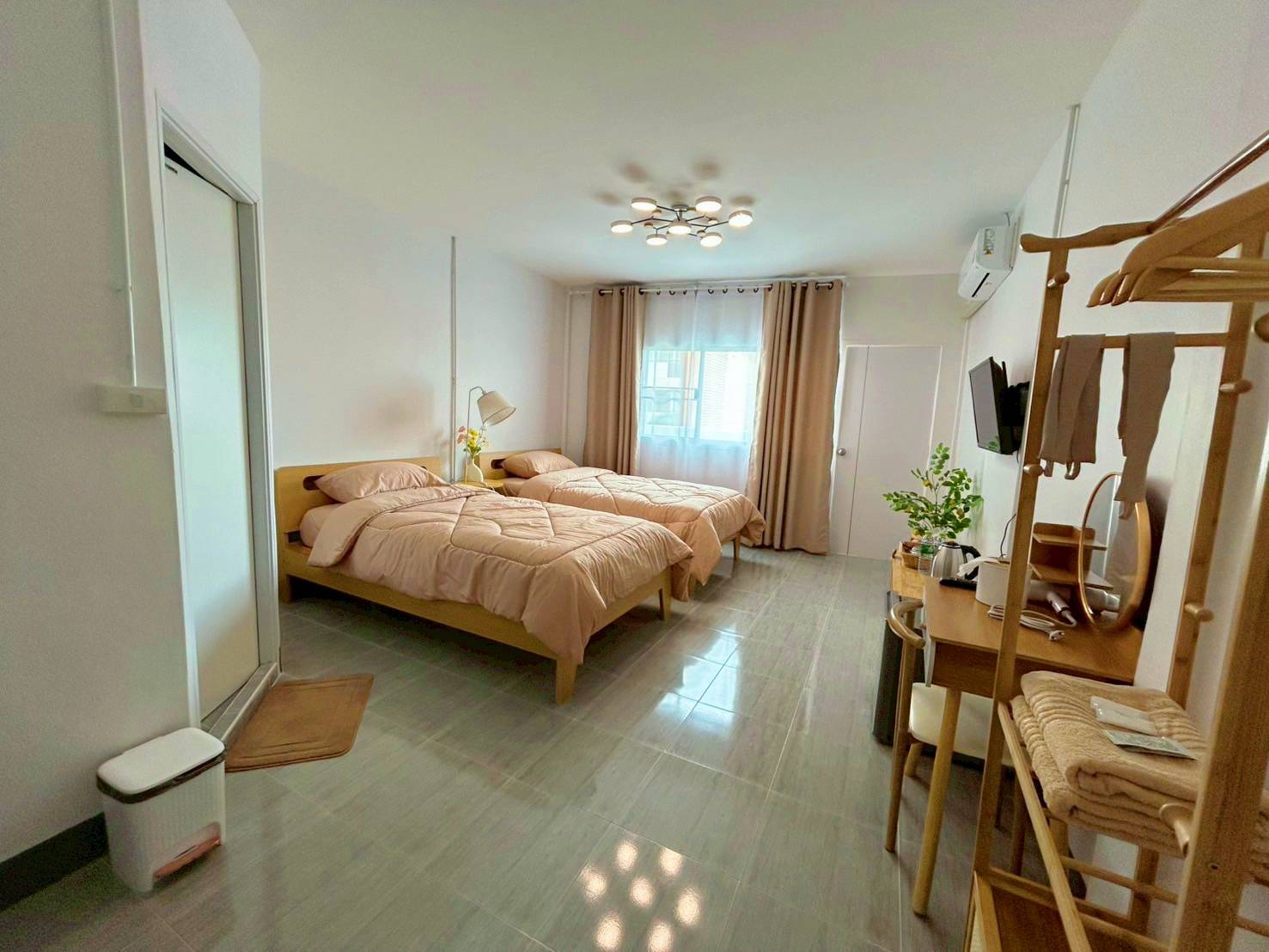 เฟอร์นิเจอร์พื้นฐาน เช่น เตียงนอน ราวแขวนผ้า โต๊ะ สมาร์ทีวี Wi-Fi ฟรี ตู้เย็น กาต้มน้ำร้อน ไดร์เป่าผม เครื่องทำน้ำอุ่นและเครื่องปรับอากาศ